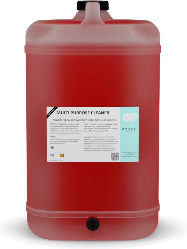 A spray and wipe, multi purpose cleaner suitable for cleaning surfaces such as floors, walls, benches and bathroom/toilet areas. Manual Cleaning: Dilute 1:40 with warm/cold water. Pressure Machine: Dilute 1:120 parts with water